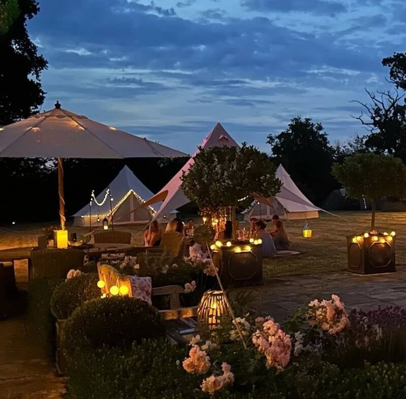 providing low picnic tables, a star canopy, bell tents and balloons, light up cube seats, table hire and chair hire.
